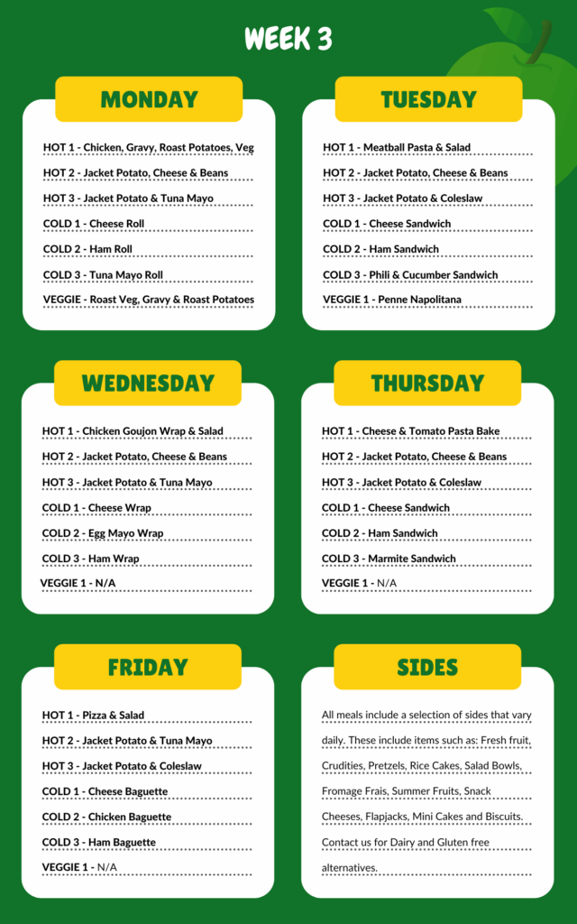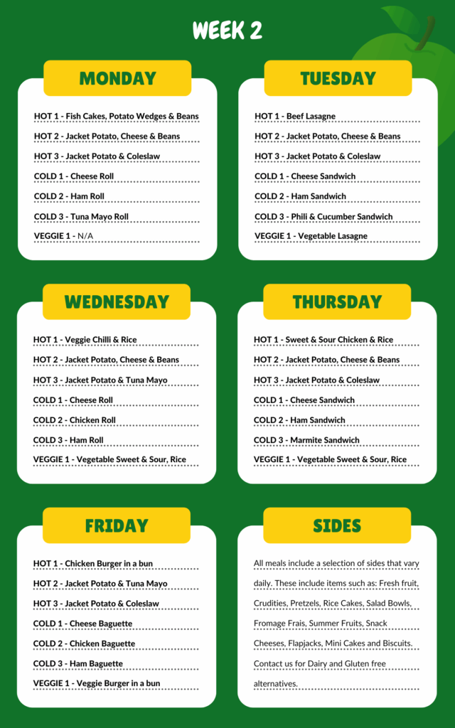 Please see below the different sample menus we currently have on rotation this term. Use the buttons below to place your lunch order, or to get in touch.